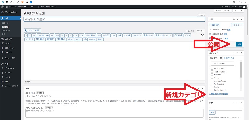 1, ワードプレスの管理画面にて、「カテゴリー(編集者の名前)」及び「パーマリンク」を変更する。
